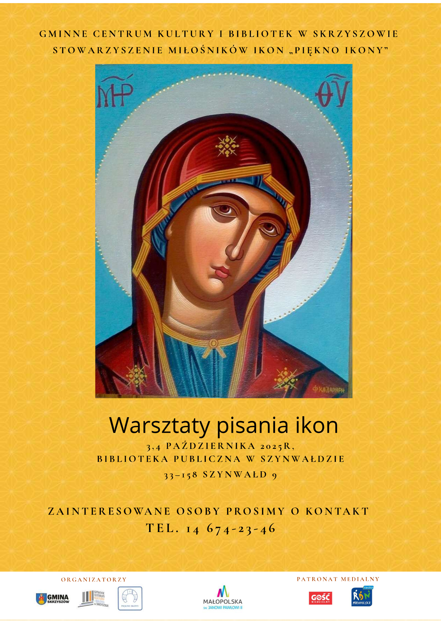 Już 3 i 4 października zapraszamy mieszkańców gminy Skrzyszów do udziału w warsztatach pisania ikon. W trakcie dwudniowego spotkania uczestnicy zostaną wprowadzeni w tematykę ikonopisarstwa. Dowiedzą się m.in. czym jest ikona i na czym polega jej fenomen. Napiszą własną ikonę według wybranego projektu (odwzorowanie przy użyciu gotowych szablonów).