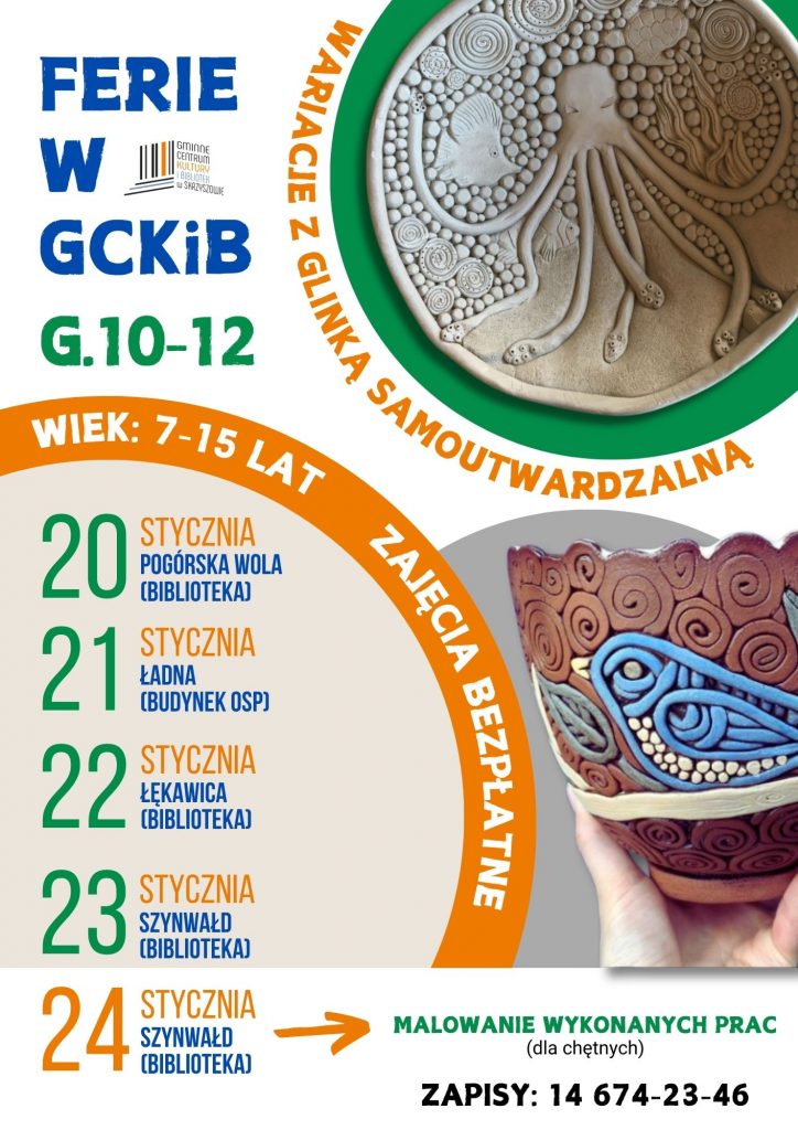 Już 20 stycznia rozpoczną się zajęcia feryjne z Gminnym Centrum Kultury i Bibliotek. Tym razem, w trakcie warsztatów, rolę pierwszoplanową odgrywać będzie glinka samoutwardzalna. Uczestnicy stworzą m.in. miseczki na biżuterię, zabawki, klucze bądź osłonki na doniczkę. Ograniczać ich będzie jedynie wyobraźnia.