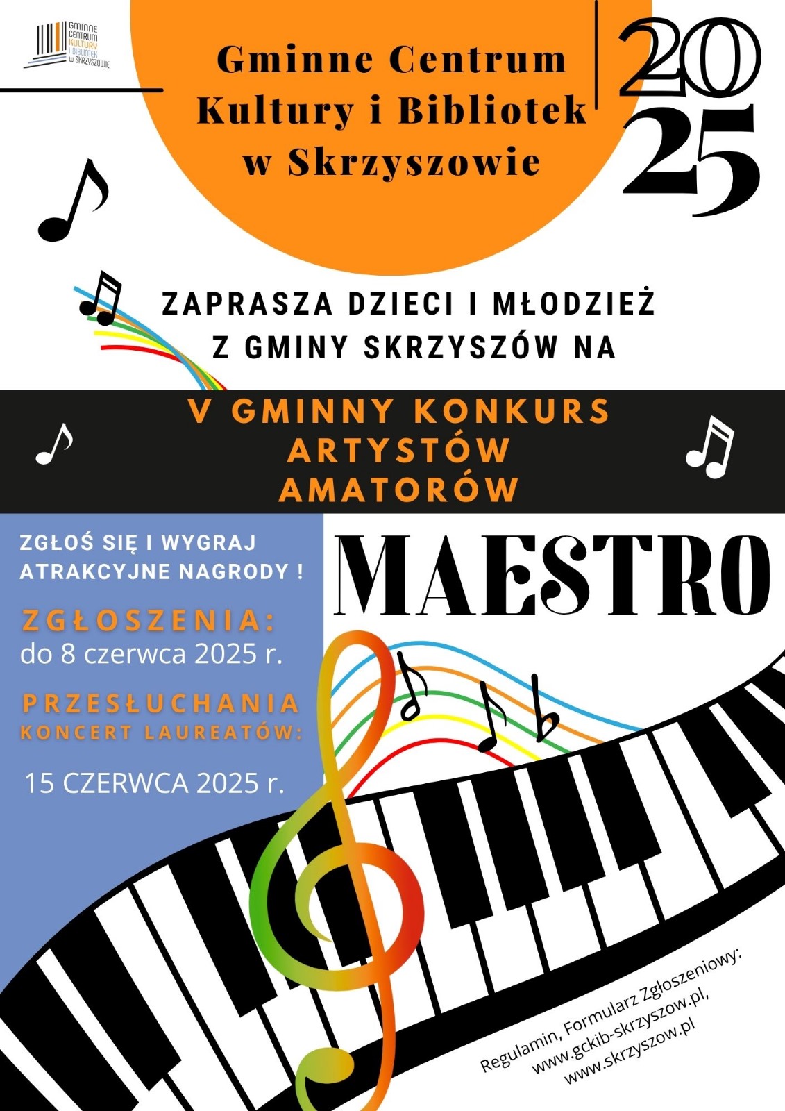 Już po raz czwarty zapraszamy wszystkich mieszkańców gminy Skrzyszów, w szczególności dzieci i młodzież, do udziału w Gminnym Konkursie Artystów Amatorów Maestro 2025.