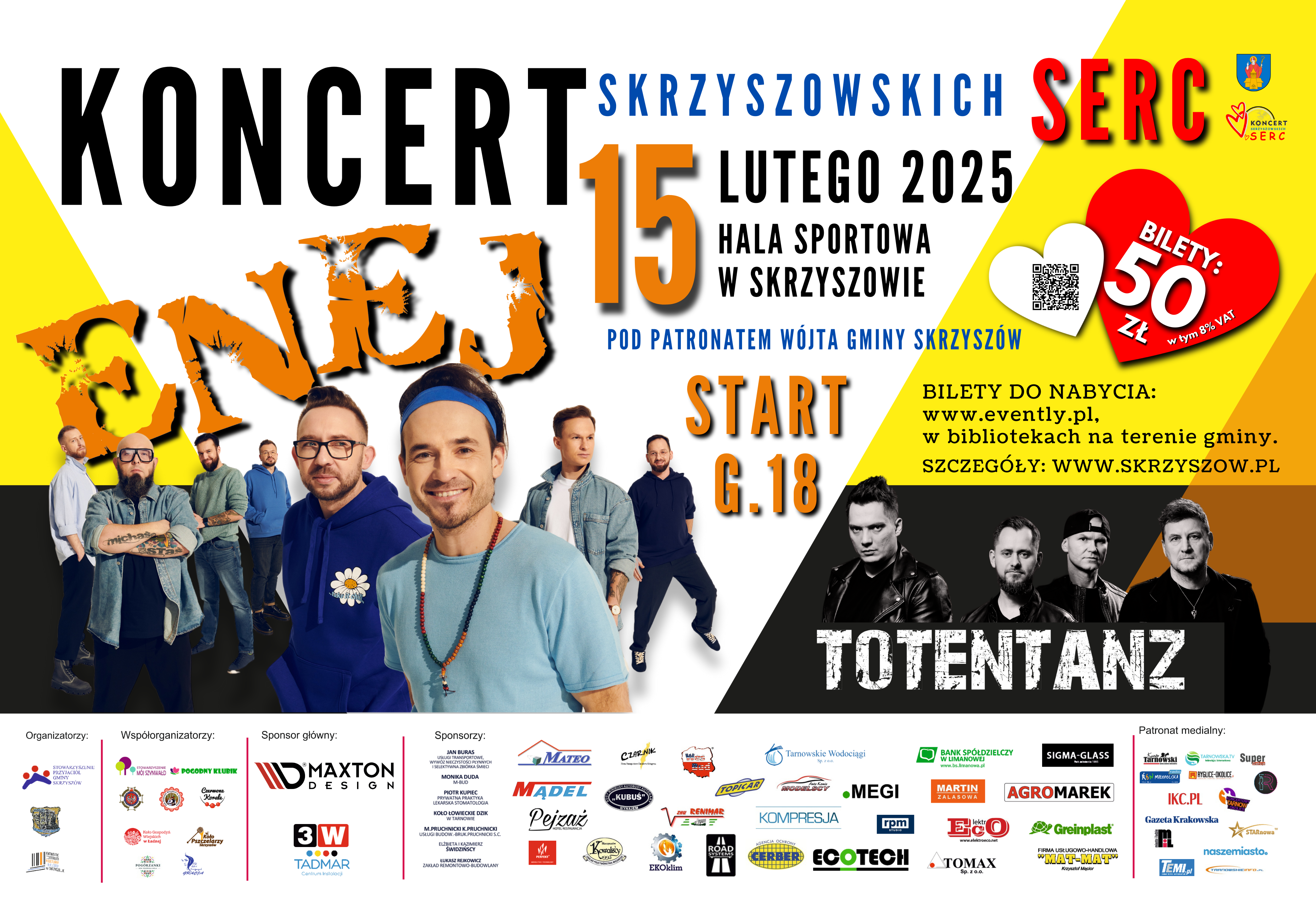 W sobotę 15 lutego 2025 roku odbędzie się XIII Koncert Skrzyszowskich Serc pod patronatem Wójta Gminy Skrzyszów. Na scenie wystąpi tarnowska grupa TOTENTANZ i znany z żywiołowych utworów zespół ENEJ. Cel koncertu pozostaje bez zmian – zbieramy dla potrzebujących, najmłodszych mieszkańców z każdej miejscowości w gminie Skrzyszów.