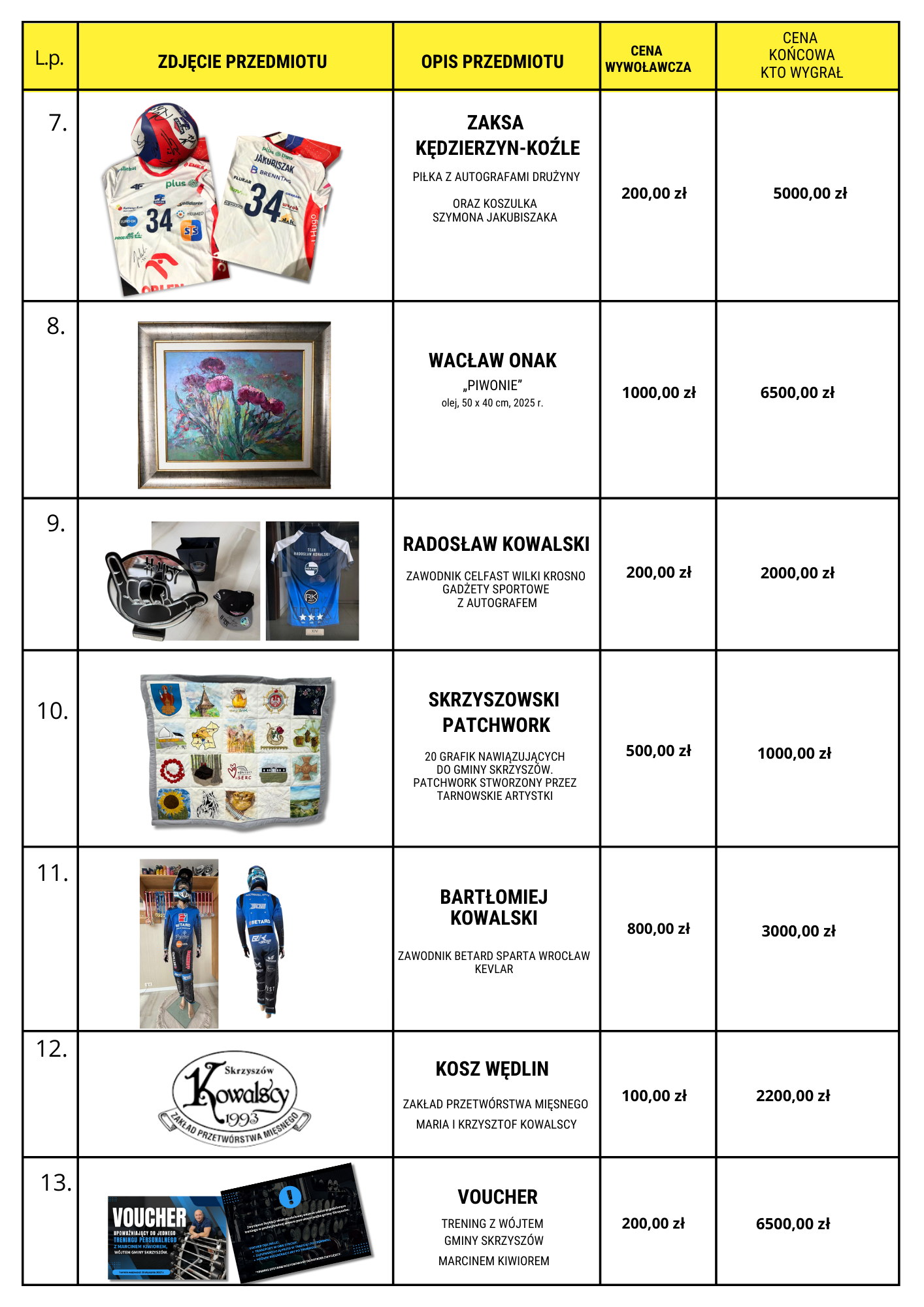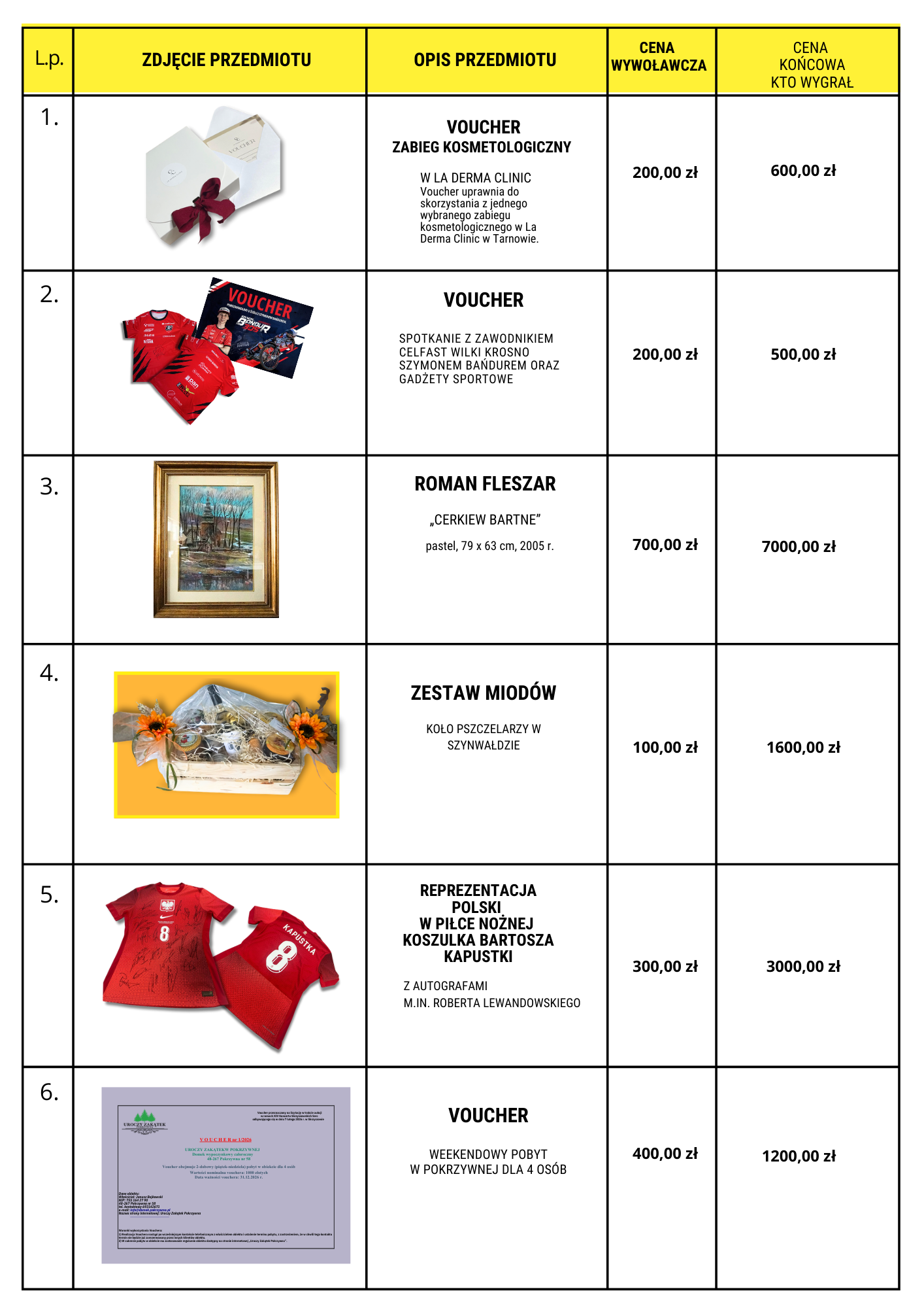 Poniżej prezentujemy wylicytowane przedmioty wraz z cenami końcowymi. Zapraszamy także do obejrzenia fotorelacji z wydarzenia.