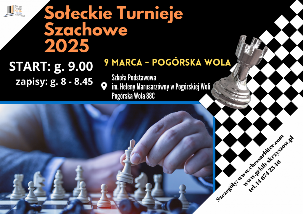 W niedzielę 9 marca w Szkole Podstawowej im. Heleny Marusarzówny w Pogórskiej Woli odbędzie się turniej szachowy „O Puchar Sołtysa Sołectwa Pogórska Wola”. Turniej zostanie rozegrany w systemie szwajcarskim na dystansie 9 rund, w tempie P-10. Zapisy w dniu turnieju od godz. 8:00. Rozpoczęcie zawodów o godz.9.