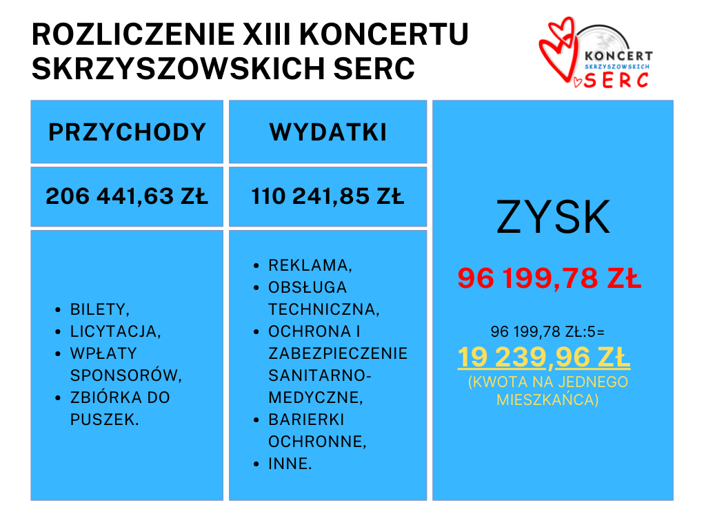 Po podsumowaniu wszystkich przychodów i kosztów organizacyjnych XIII Koncertu Skrzyszowskich Serc, pragniemy poinformować, że dla potrzebujących mieszkańców zebrano kwotę 96 199,78 zł, co oznacza, że na jednego mieszkańca przypada imponująca kwota 19 239,96 zł. Uzyskane środki zostaną przeznaczone m.in. na turnusy rehabilitacyjne, dostosowanie pomieszczeń dla osób z niepełnosprawnościami czy konsultacje u specjalistów.