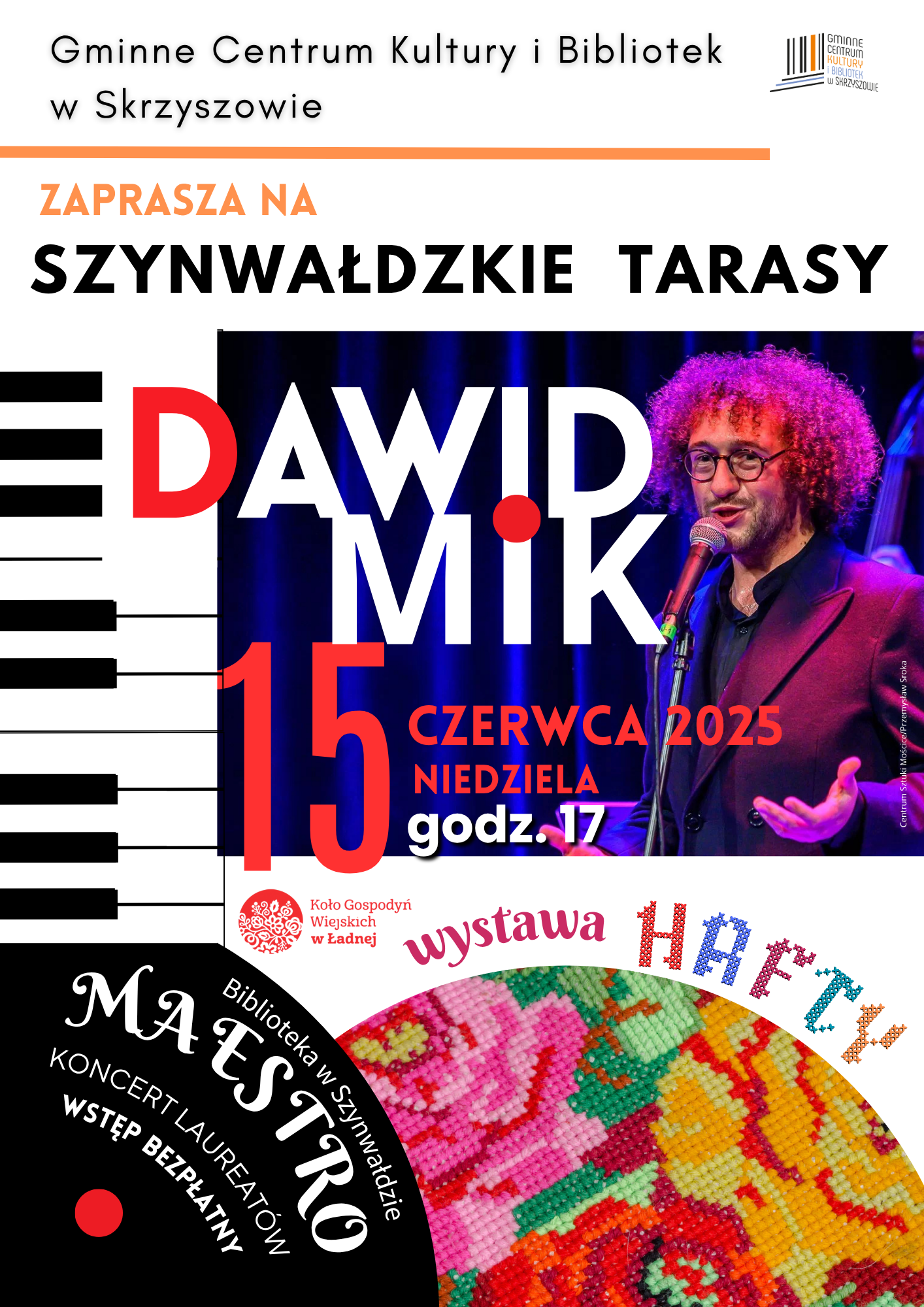 Wieczór rozpoczniemy otwarciem wystawy „Haftów” Koła Gospodyń Wiejskich w Ładnej. Następnie poznamy laureatów konkursu Maestro oraz odbędzie się koncert Dawida Mika.